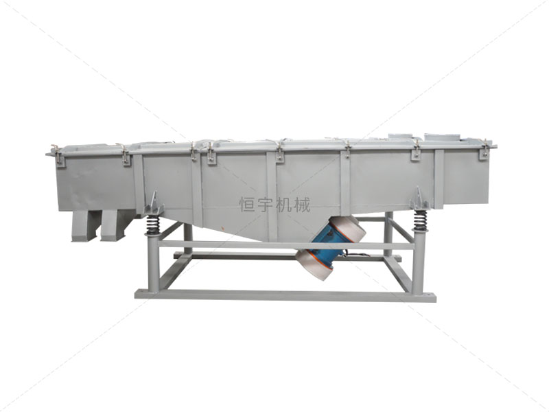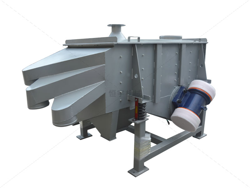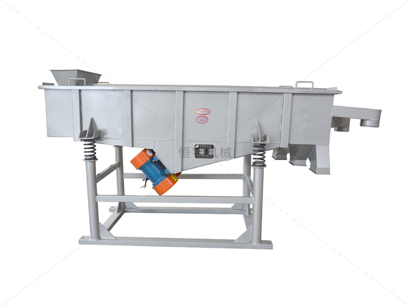 大型直線振動篩采用優質振動電機做為振動源,本篩機配有兩臺振動電機,工作時兩臺電機偏心塊做相反方向轉動,水平方向兩臺電機合力為零,垂直于電機軸方向形成一合力,電機軸與篩板成一定夾角,合力使物料在篩網上被拋起,同時向前做運動。物料從經給料機均勻地進入篩機的進料口,通過多層不同孔徑篩網產生數種產品和不合格的篩上物、篩下物分別從各自的出口排出。