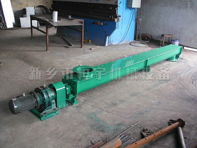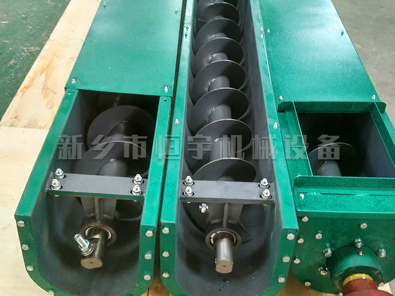 U型螺旋輸送機是一種利用電機帶動螺旋回轉,推移物料以實現輸送目的的機械。當螺旋軸轉動時,由于物料的重力及其與槽體壁所產生的摩擦力,使物料只能在葉片的推送下沿著輸送機的槽底向前移動,其情況好像不能旋轉的螺母沿著旋轉的螺桿作平移運動一樣。物料在中間軸承的運移,則是依靠后面前進著的物料的推力。所以,物料在輸送機中的運送,完全是一種滑移運動。