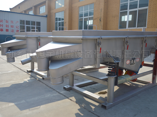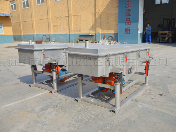 直線振動篩由篩箱、振動電機、減振系統及底架等組成。篩箱由槽體、上蓋、進料口、篩框、篩板(網)、襯網、出料口等組成。減振系統由阻尼彈簧和彈簧座等組成。